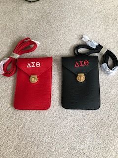 Red cell phone crossbody bag with white DST symbols