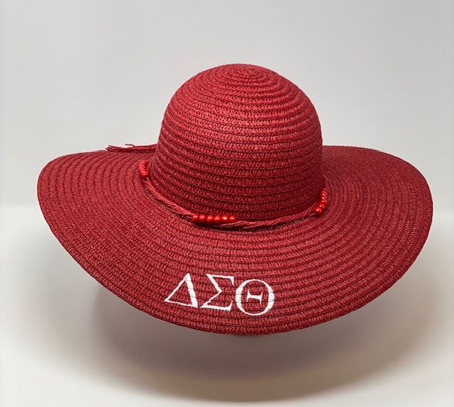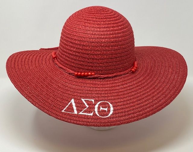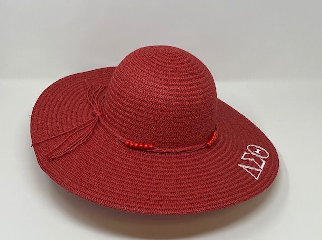Red firm mid brim straw hat with white DST symbols